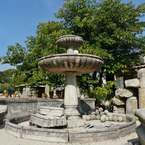 Wonderful stone wall-fountain with dolphins and cast-iron Medici vases ** SOLD
