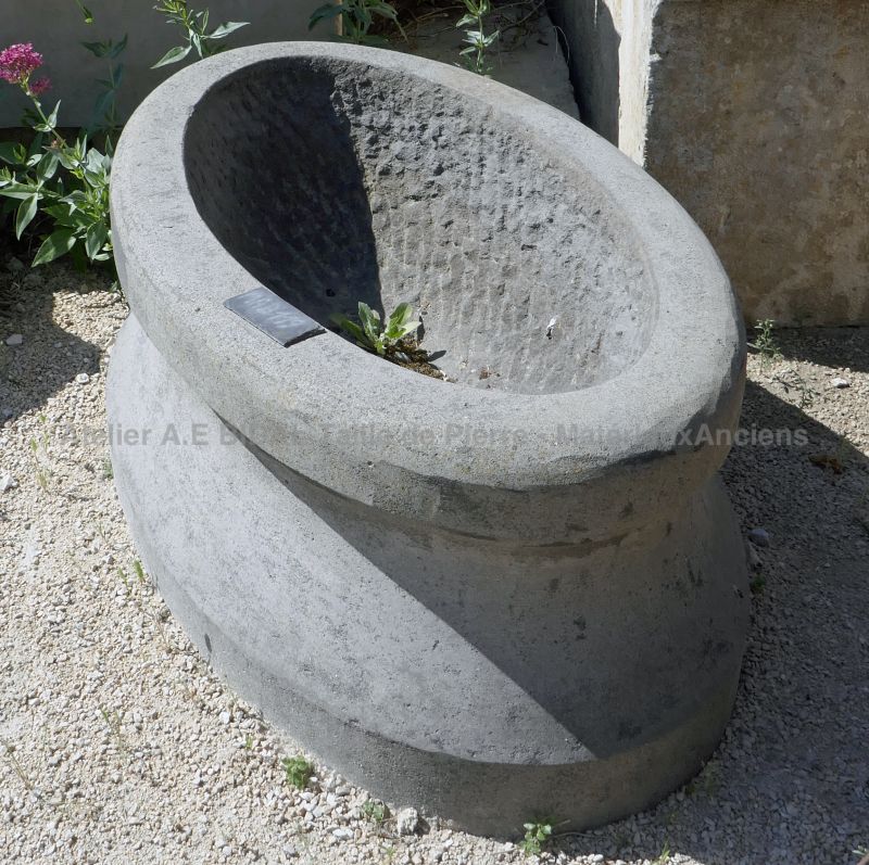 Oval shape lava stone basin with fine moldings. Smooth surface outside and rough bush hammered finish on the inside. This is a unique and original item to adorn a garden or a terrace.