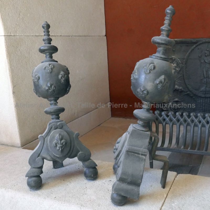 Paire de chenets anciens en métal ornés de fleurs de lys