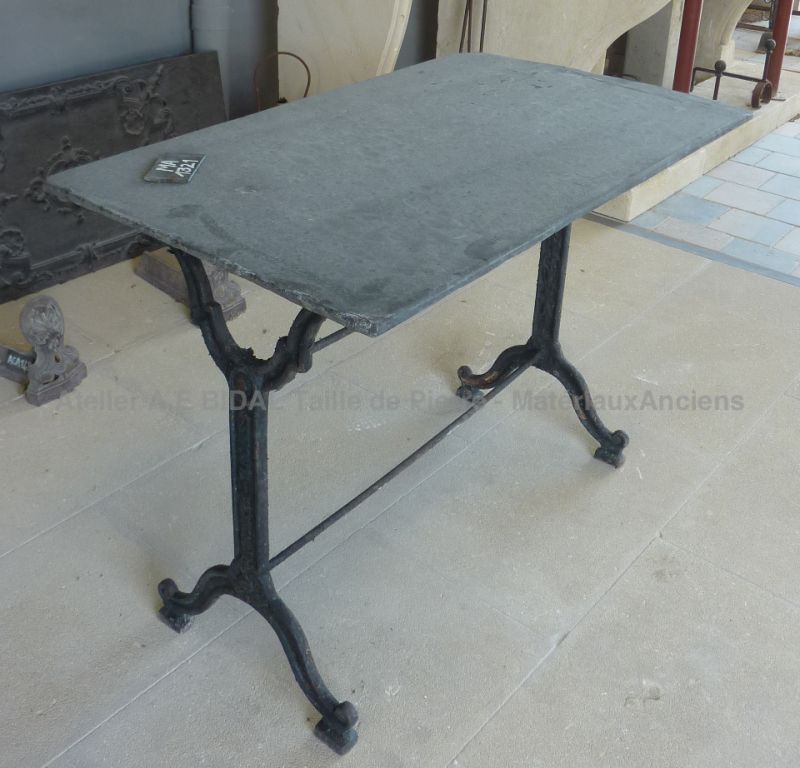Table de bistrot ancienne : plateau en ardoise et pieds en fonte