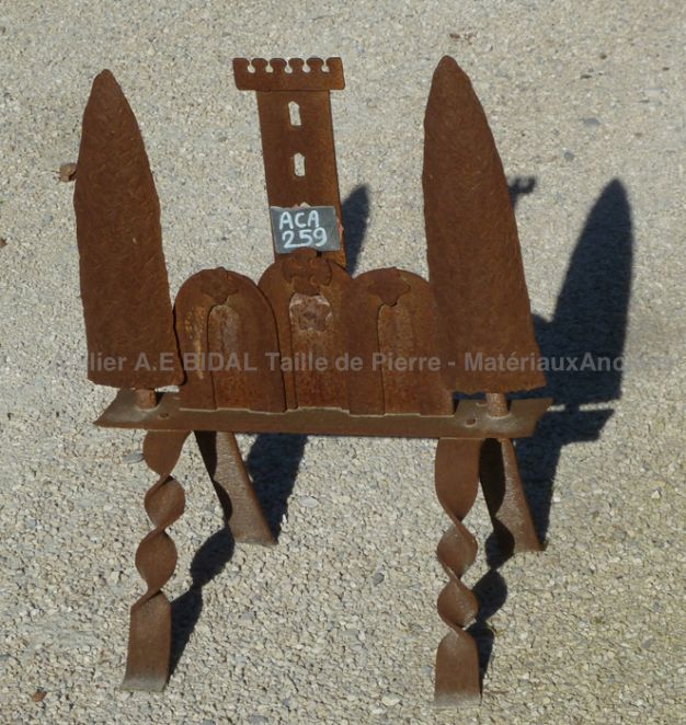 Ancien pare-feu représentant un château et sa tour, et de part et d'autre deux grands cyprès. Le tout posé sur 4 pieds en fer forgé torsadés.